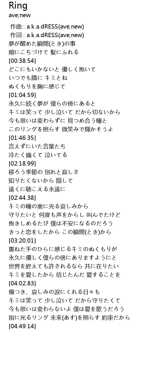| [04:33.15] | 指に光るリング 未来(あす)を照らす 約束だから |