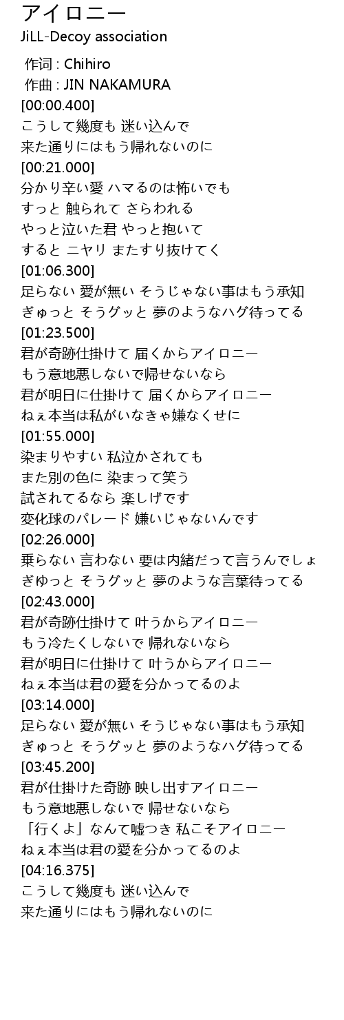 | [02:43.312] | 君が奇跡仕掛けて 叶うからアイロニー |