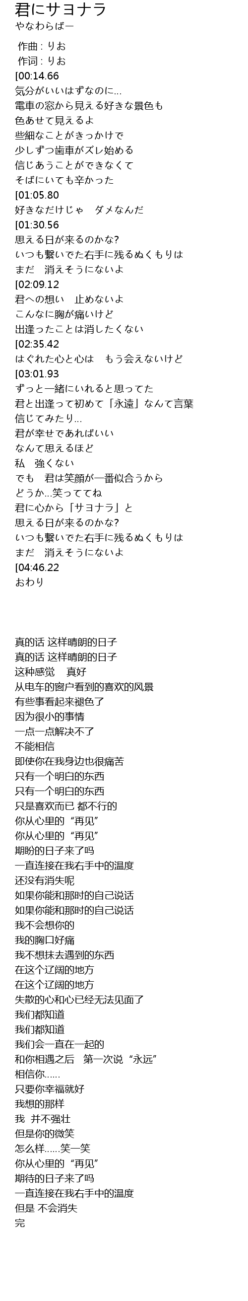 | [01:29.59][01:30.56] | 君に心から「サヨナラ」と |