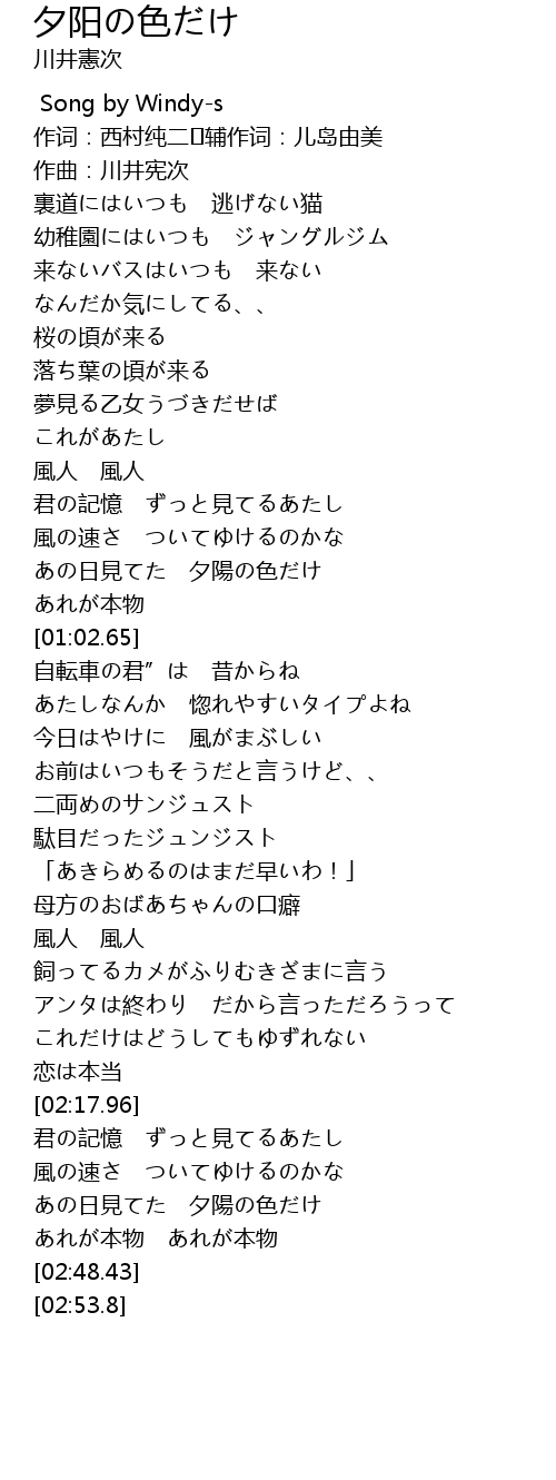 | [00:55.58] | あの日見てた 夕陽の色だけ |