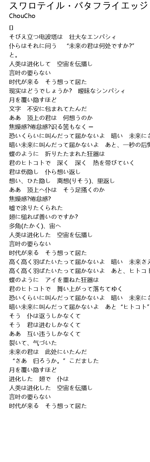 | 高く高く羽ばたいたって届かないよ 暗い 未来さえも | |