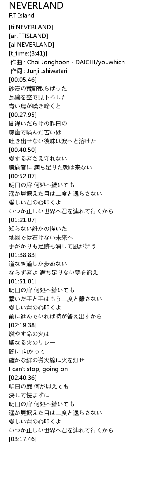 | [03:08.22] | いつか正しい世界へ君を連れて行くから |