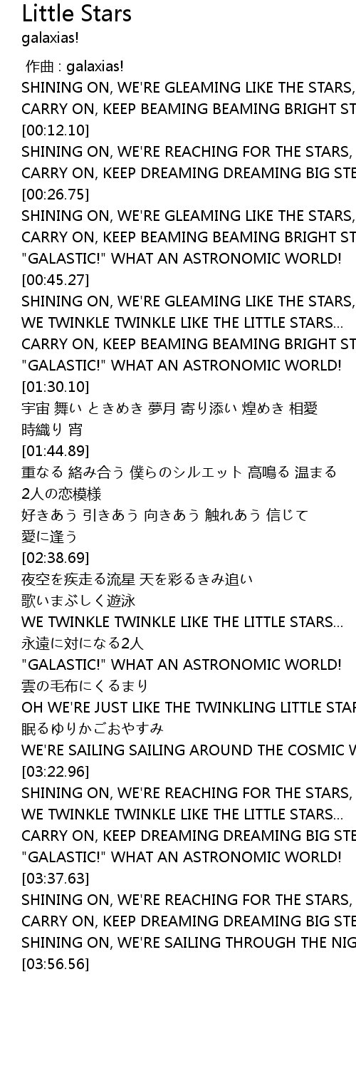 | [02:57.04] | WE TWINKLE TWINKLE LIKE THE LITTLE STARS... |