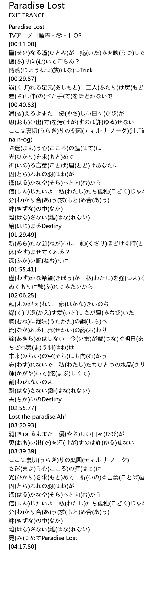 | [04:12.38] | 見(み)つめてParadise Lost |