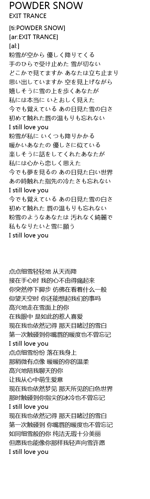 | [00:12.77] | 粉雪が空から 優しく降りてくる |