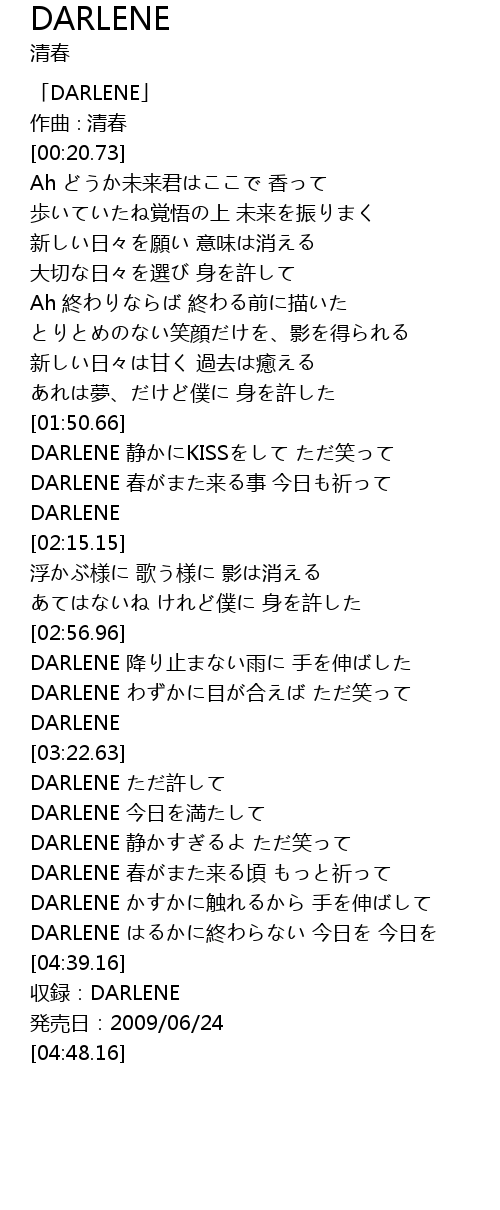 | [03:54.07] | DARLENE 静かすぎるよ ただ笑って |