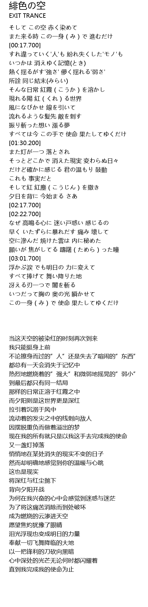 | [00:51.600] | 現れる陽 紅(くれ)る世界 |