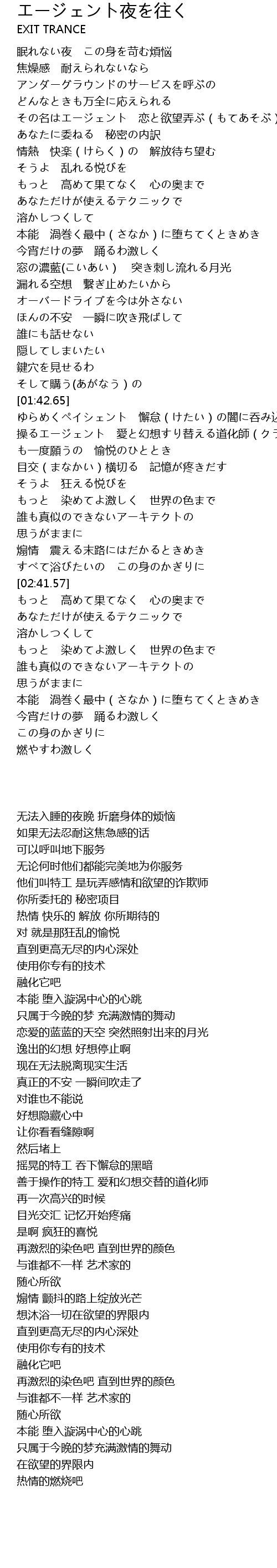| [00:41.01] | 情熱 快楽(けらく)の 解放待ち望む |
