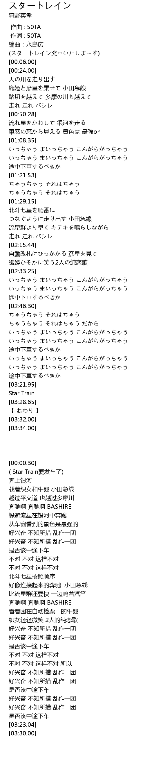 | [00:29.68] | 織姫と彦星を乗せて 小田急線 |