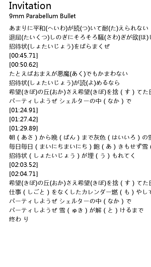 | [00:34.86] | 招待状(しょたいじょう)をばらまくぜ |