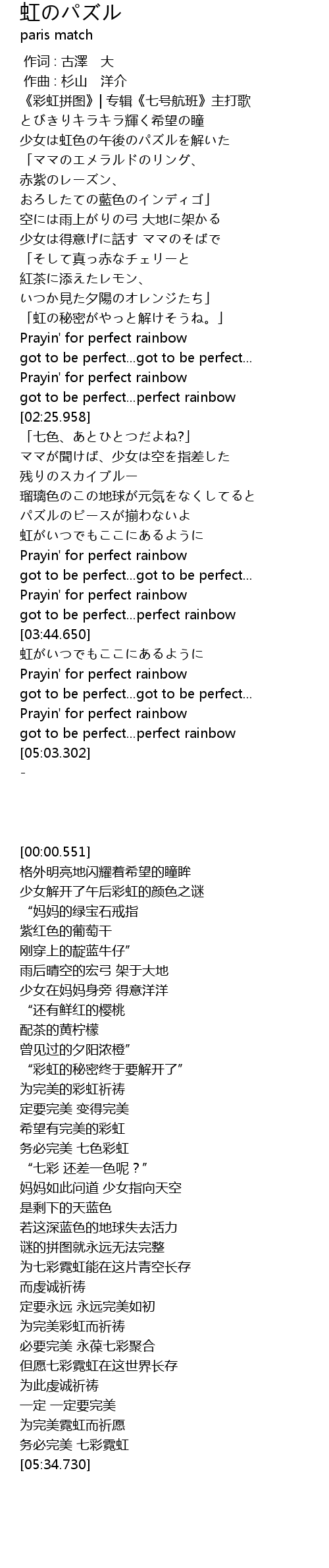 | [02:19.311] | Prayin' for perfect rainbow |