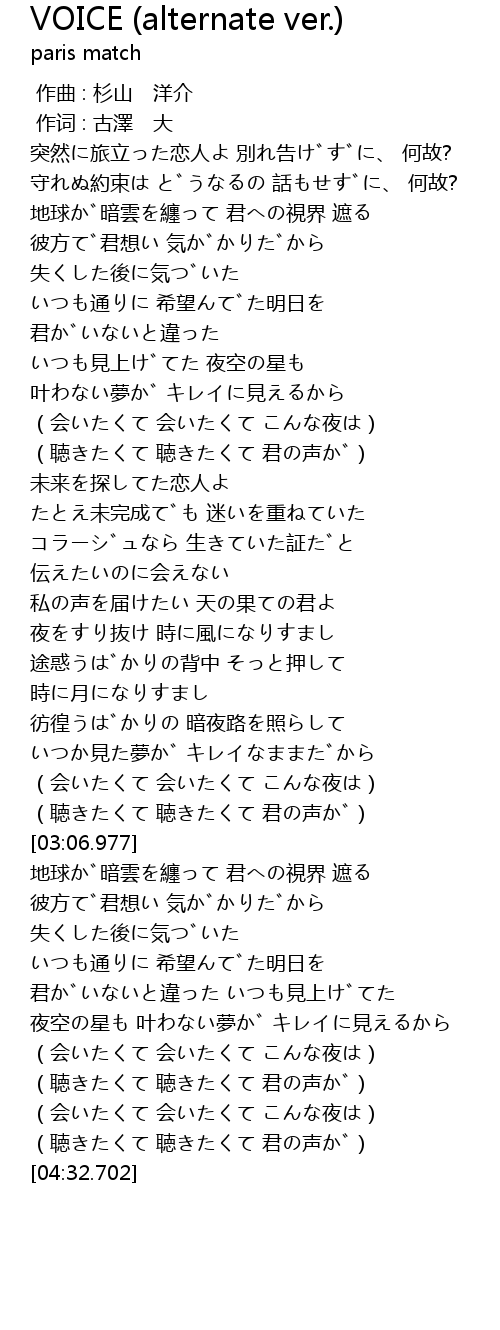 | [02:59.321] | (聴きたくて 聴きたくて 君の声が) |