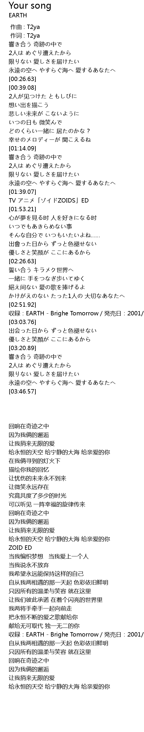 | [02:57.94] | 収録:EARTH - Brighe Tomorrow/発売日:2001/03/28 |