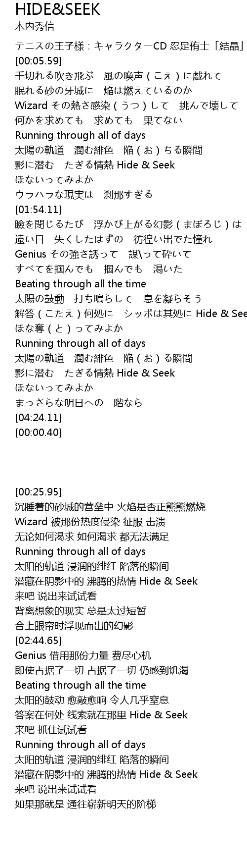 | [04:00.03] | 影に潜む たぎる情熱 Hide & Seek |