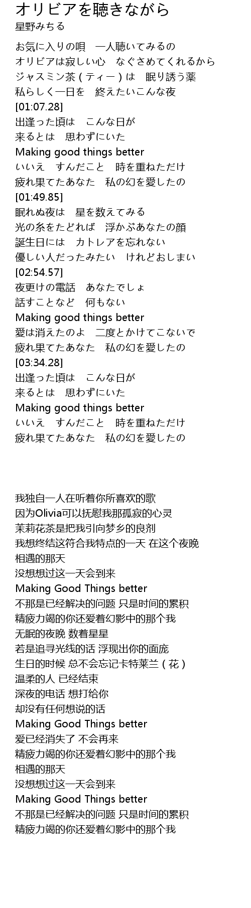 | [00:27.90] | オリビアは寂しい心 なぐさめてくれるから |