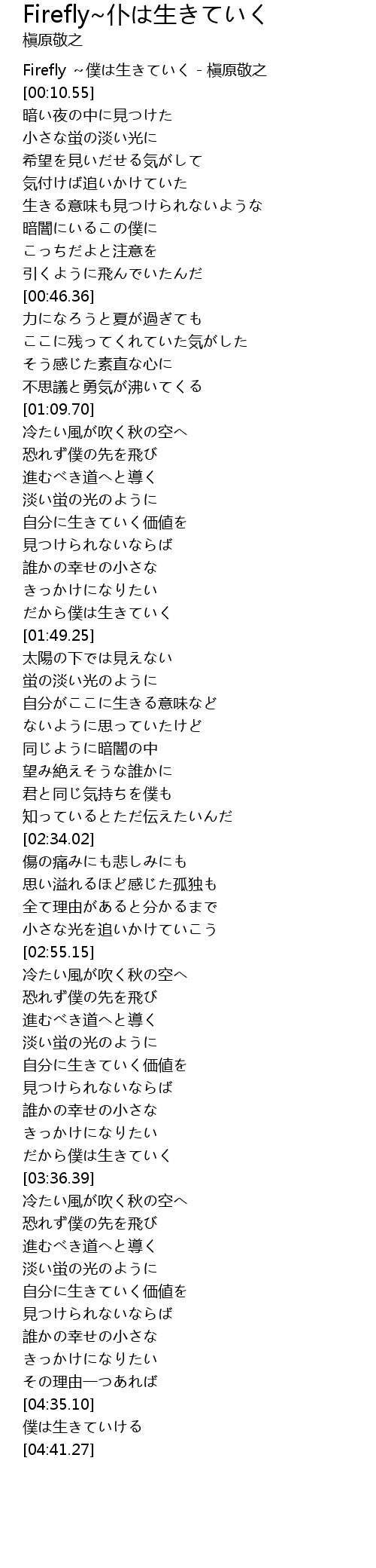 | [00:01.56] | Firefly ~僕は生きていく - 槇原敬之 |