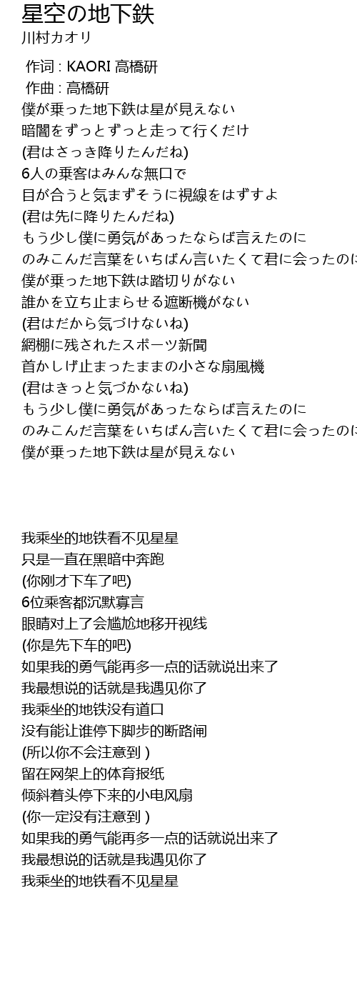 | [00:21.10] | 僕が乗った地下鉄は星が見えない |