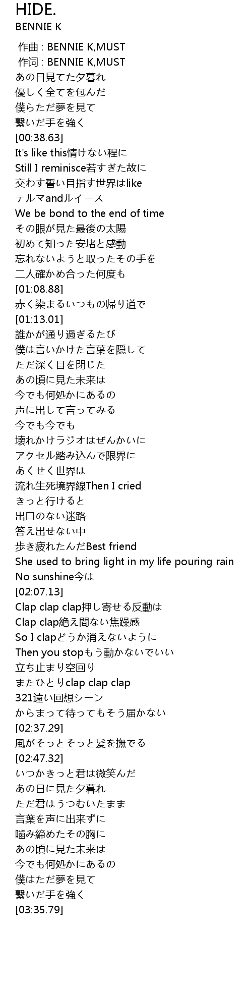 | [00:01.00] | 作词 : BENNIE K,MUST |
