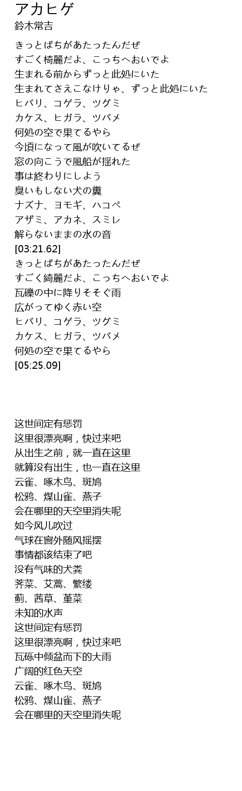 | [05:01.78] | ヒバリ、コゲラ、ツグミ |