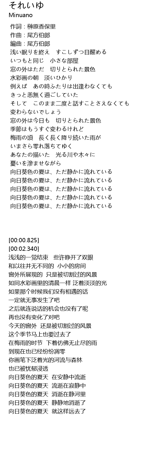 | [04:29.521] | 向日葵色の夏は、ただ静かに流れている |