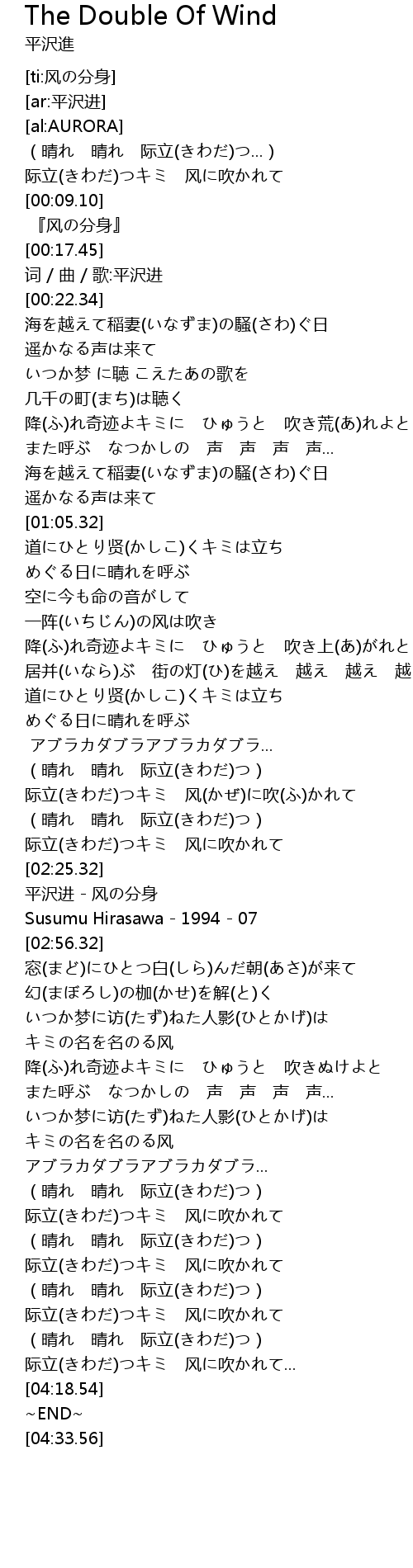 | [04:04.32] | 际立(きわだ)つキミ 风に吹かれて |