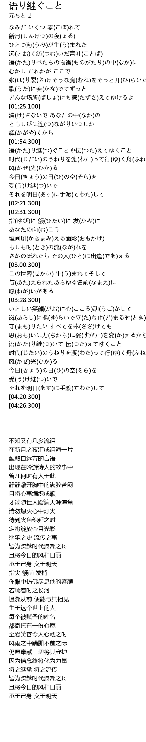 | [01:55.800] | 语(かた)り継(つ)ぐことや伝(つた)えてゆくこと |