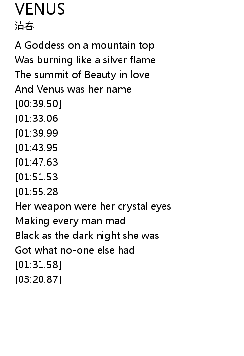 | [02:28.14][01:47.63][00:55.59] | Well, I'm your Venus, I'm your fire |