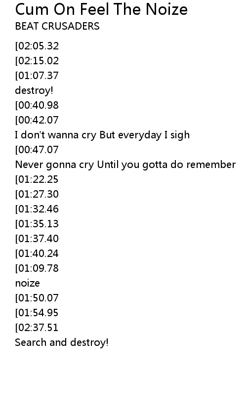 | [01:05.09][01:09.78][01:42.82][01:47.66][02:25.19][02:29.98] | Cum on feel the noize |