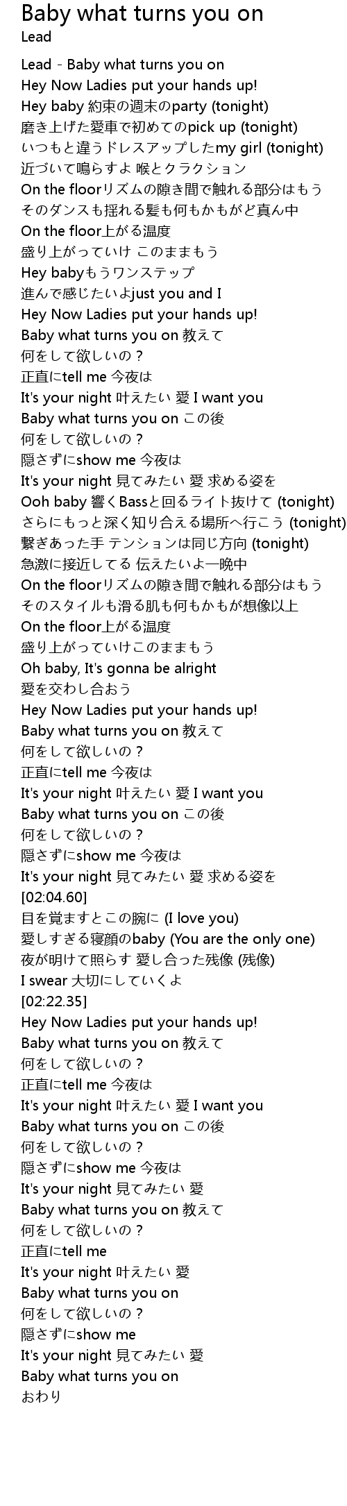 | [01:09.24] | Ooh baby 響くBassと回るライト抜けて (tonight) |