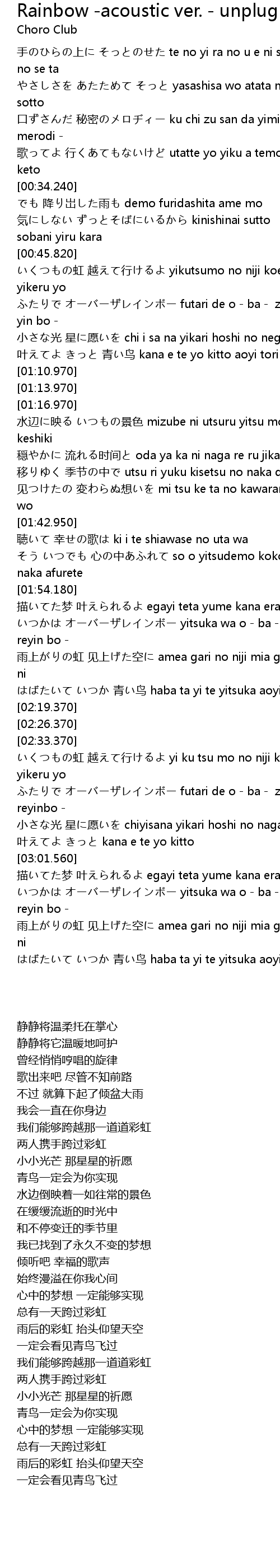 | [03:13.030] | 雨上がりの虹 见上げた空に amea gari no niji mia geta sora ni |