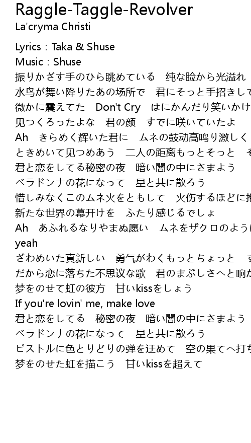 | Ah あふれるなりやまぬ愿い ムネをザクロのようにひきさくよ oh yeah | |
