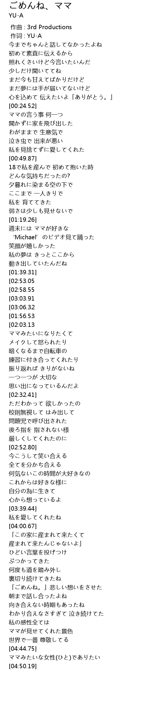 | [03:39.77][02:53.05][01:39.79] | ママの言う事 何一つ |