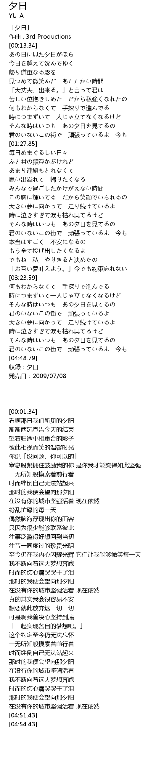 | [04:04.59] | そんな時はいつも あの夕日を見てるの |