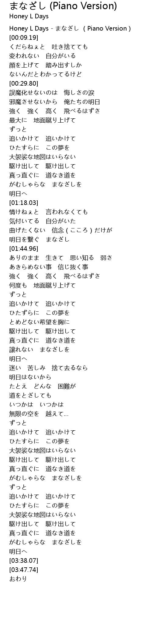 | [00:00.00] | Honey L Days - まなざし (Piano Version) |