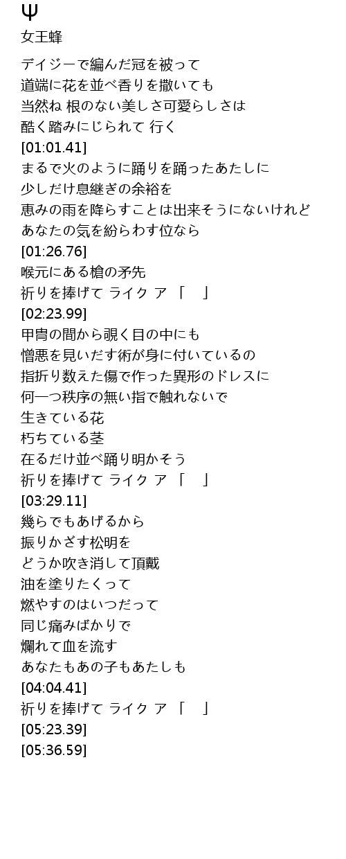 | [05:10.88] | 祈りを捧げて ライク ア 「 」 |