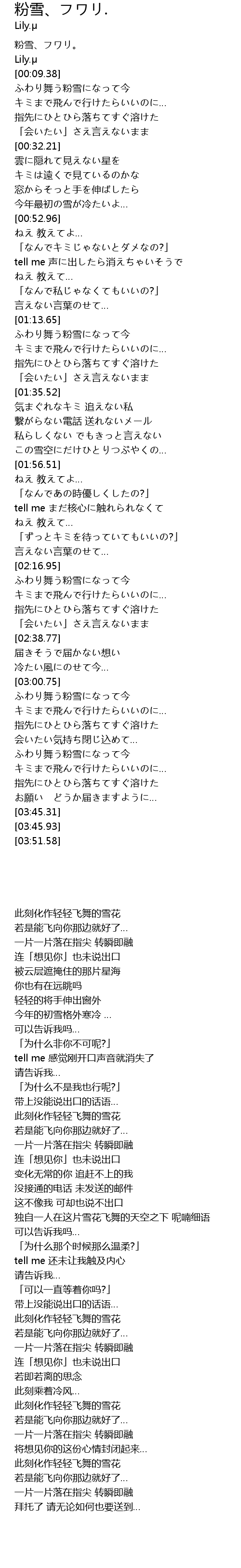 | [03:02.21] | ふわり舞う粉雪になって今 |