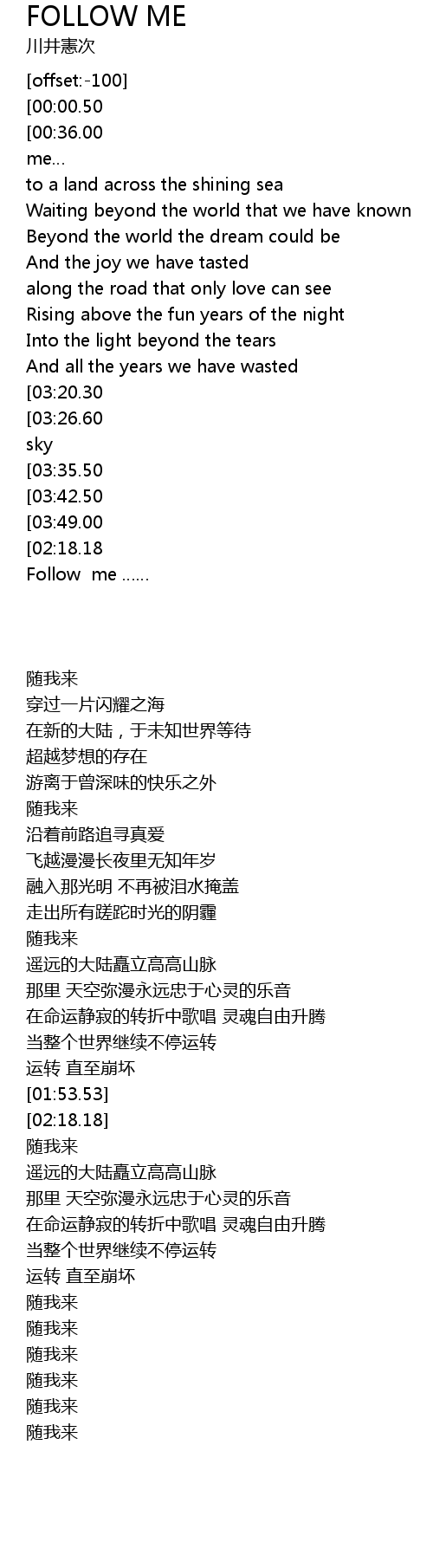 | [00:01.00][00:36.00][01:11.11][03:14.30][03:57.86][04:04.00][04:13.80][04:25.50][04:33.80] | Follow me |