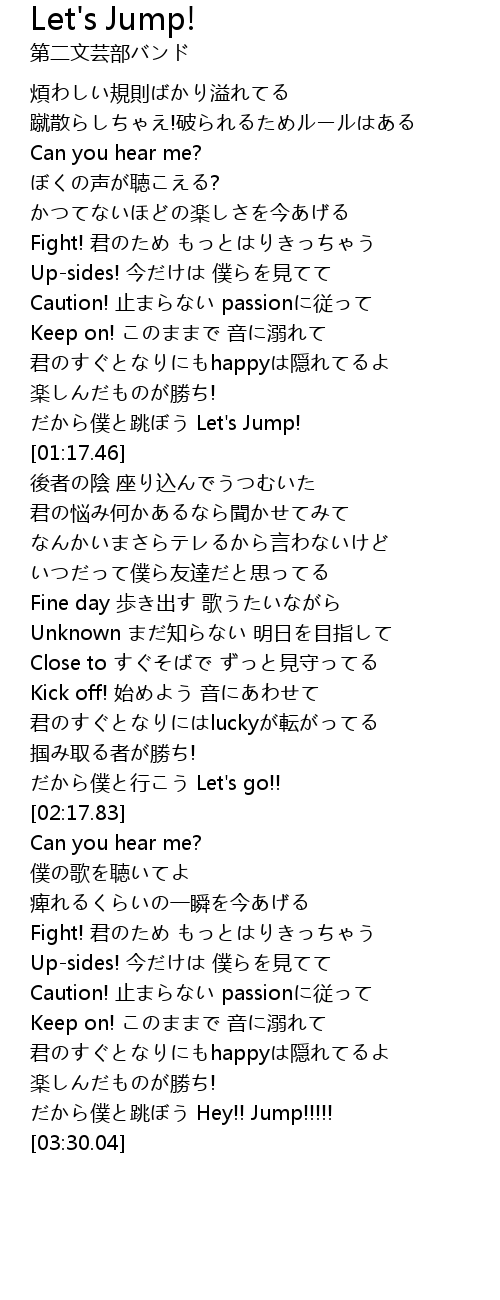 | [03:25.54] | だから僕と跳ぼう Hey!! Jump!!!!! |
