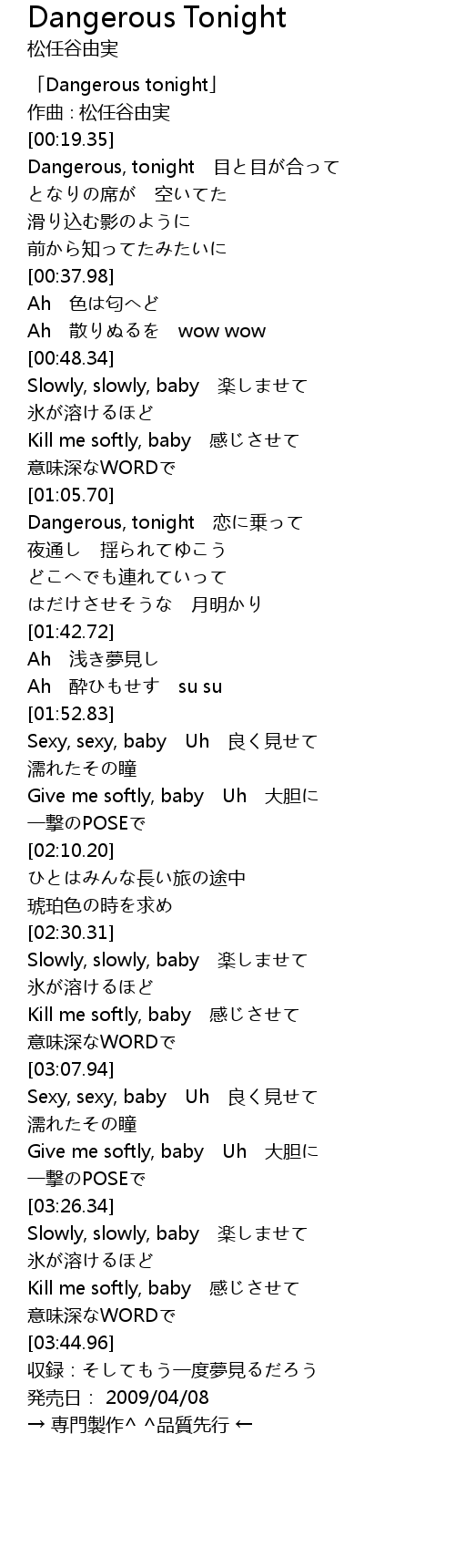 | [01:25.82] | Dangerous, tonight 恋に乗って |