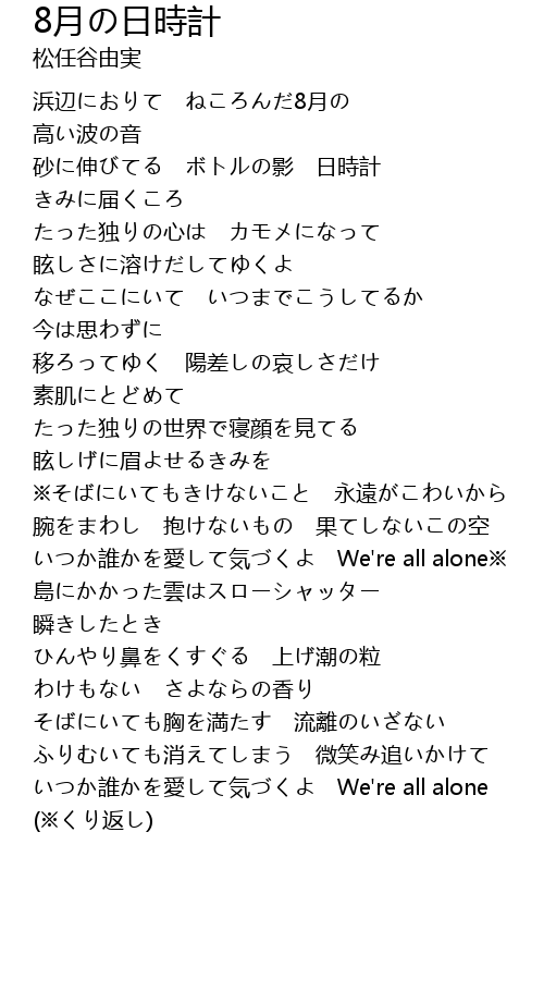 | [02:00.893] | いつか誰かを愛して気づくよ We're all alone※ |