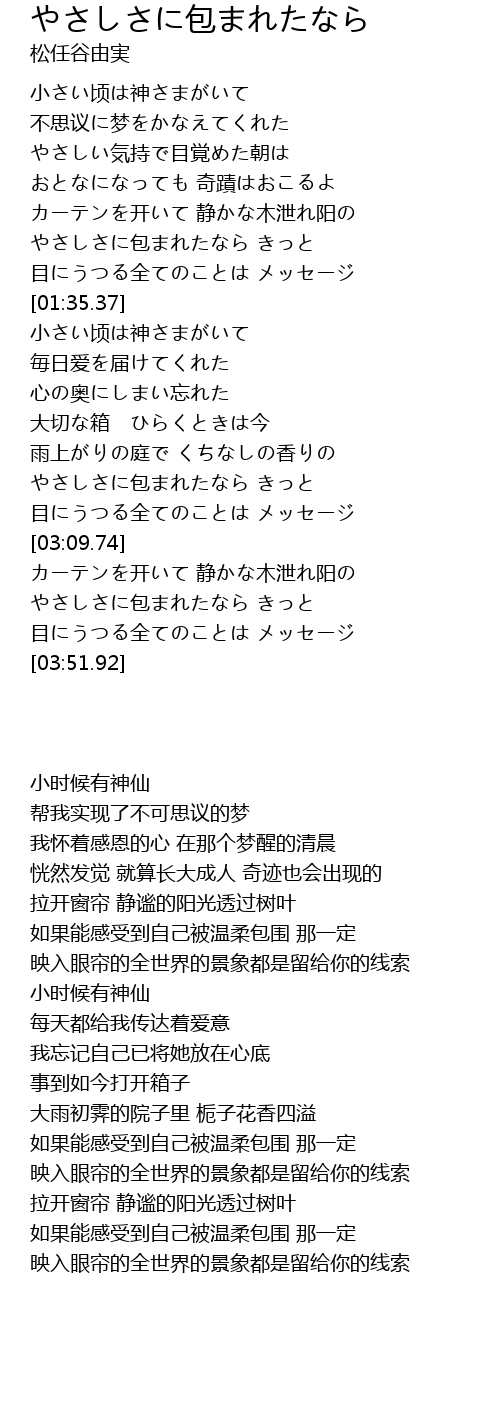 | [01:12.37] | やさしさに包まれたなら きっと |