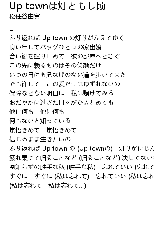 | ふり返れば Up town の (Up townの) 灯りがにじんでる | |