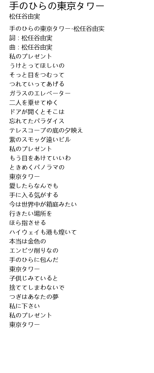| [00:00.601] | 手のひらの東京タワー-松任谷由实 |