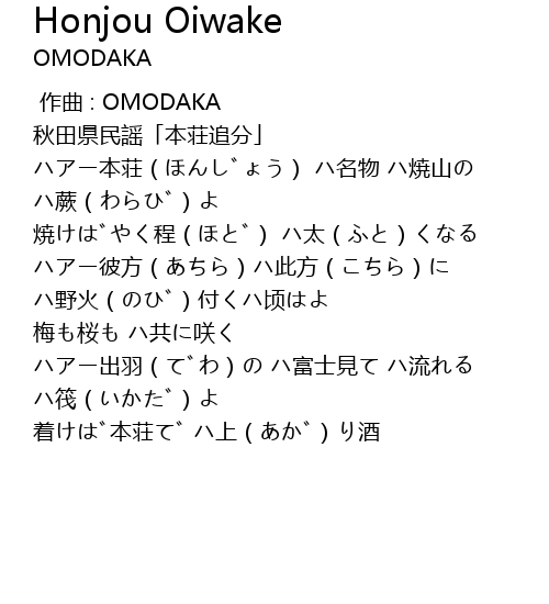 | [00:14.342] | ハアー本荘(ほんじょう) ハ名物 ハ焼山の ハ蕨(わらび)よ |