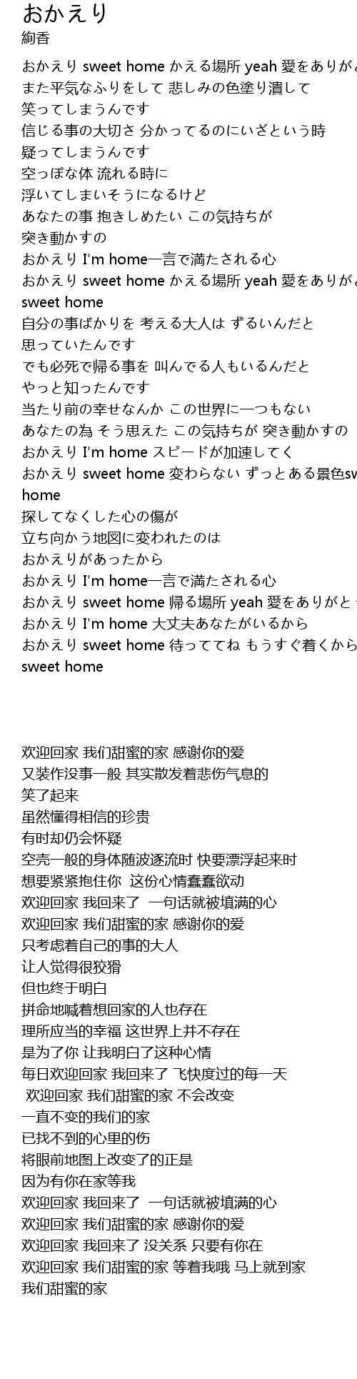 | [00:01.200] | おかえり sweet home かえる場所 yeah 愛をありがとう |