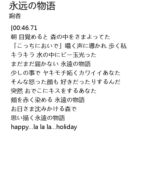 | [00:00.00] [00:46.71] [02:03.13] | 絢香-永遠の物語 |