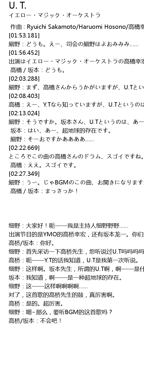 | [02:13.024] | 細野:そうですか。坂本さん、U.Tというのは、あー、どんな意味みみみみ・……? |