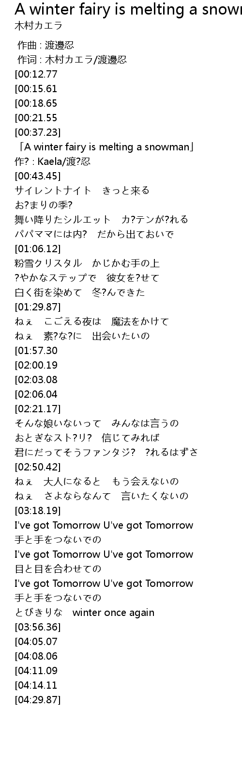 | [02:11.93][02:00.19] | A winter fairy is melting a snowman |