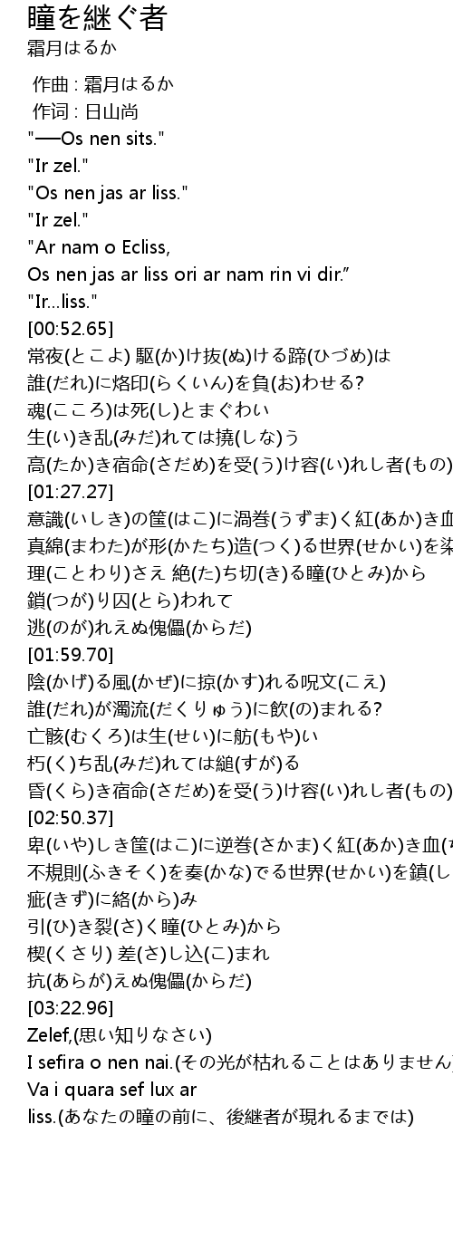| [02:42.62] | 昏(くら)き宿命(さだめ)を受(う)け容(い)れし者(もの)に告(つ)ぐ |