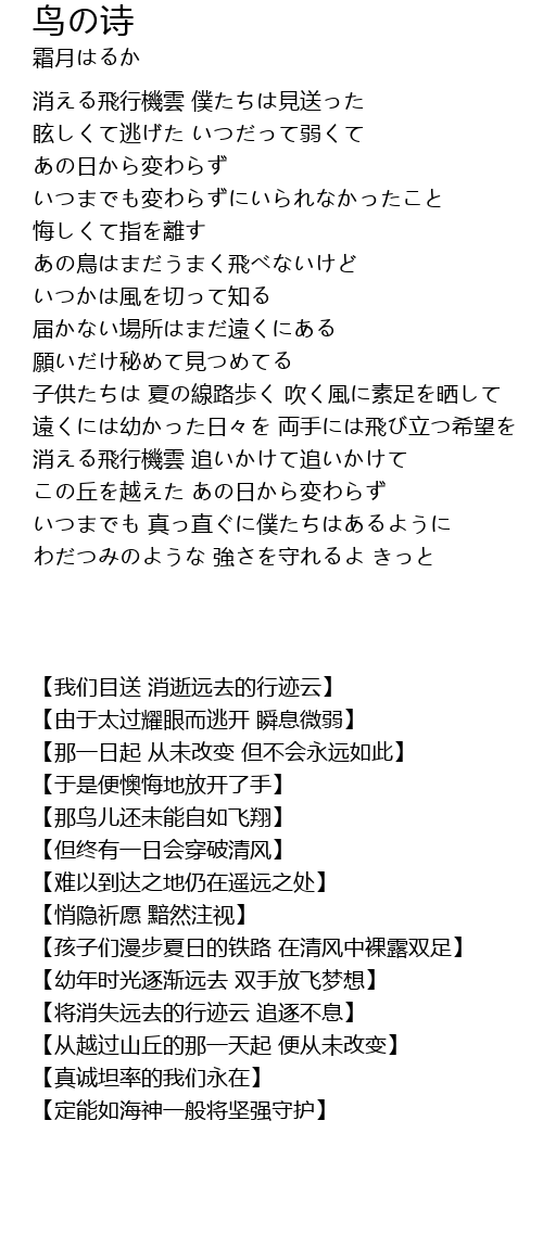 | [01:12.16] | あの鳥はまだうまく飛べないけど |